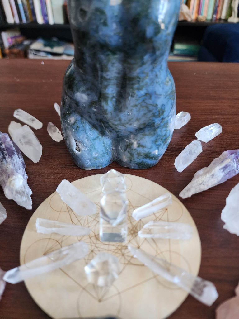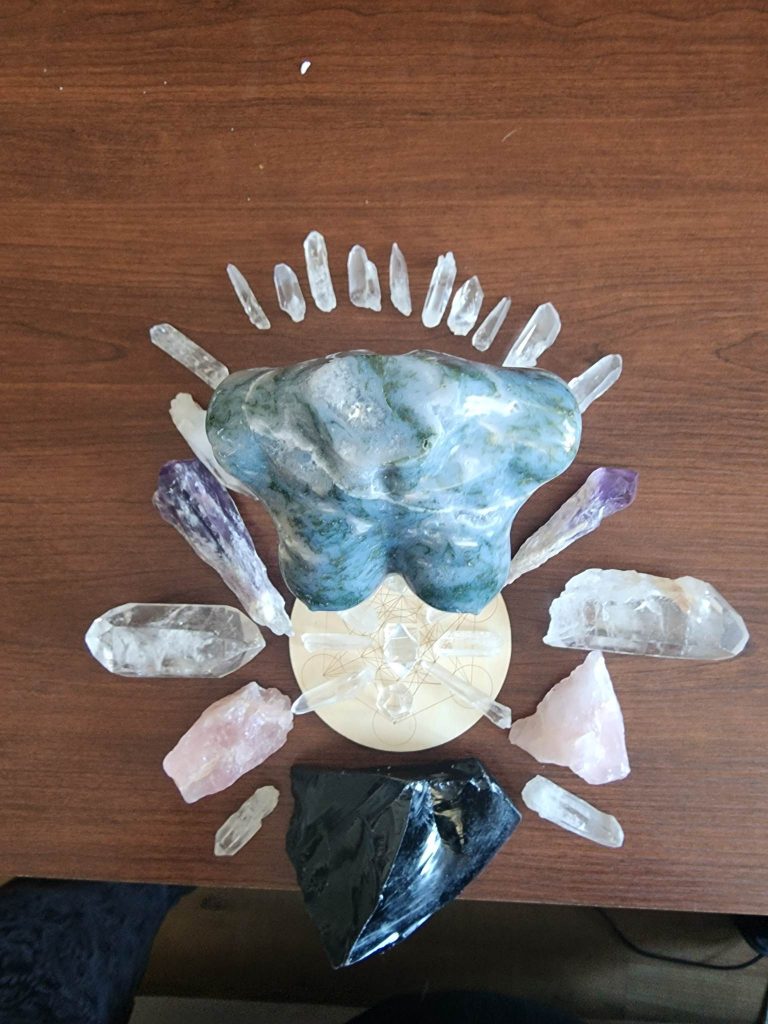 This crystal grid for February emphasis our spirit becoming physical, and this gorgeous Moss Agate shaped into the feminine form emcompasses the growth, elevation, and anchoring of Soul manifesting. The Lemurian quartz shaped as a half Sun rising at the top signifies the New Age od enlightenment, with access to our hall of Records/Akashic records, and balance of our divine mind of God/dess/Source-Light , metatrons Cube with the Platonic solids placed above to anchor in the sacred geometry transfigured to your highest timeline and the Amythest to give you mental clarity and peace with stillness.